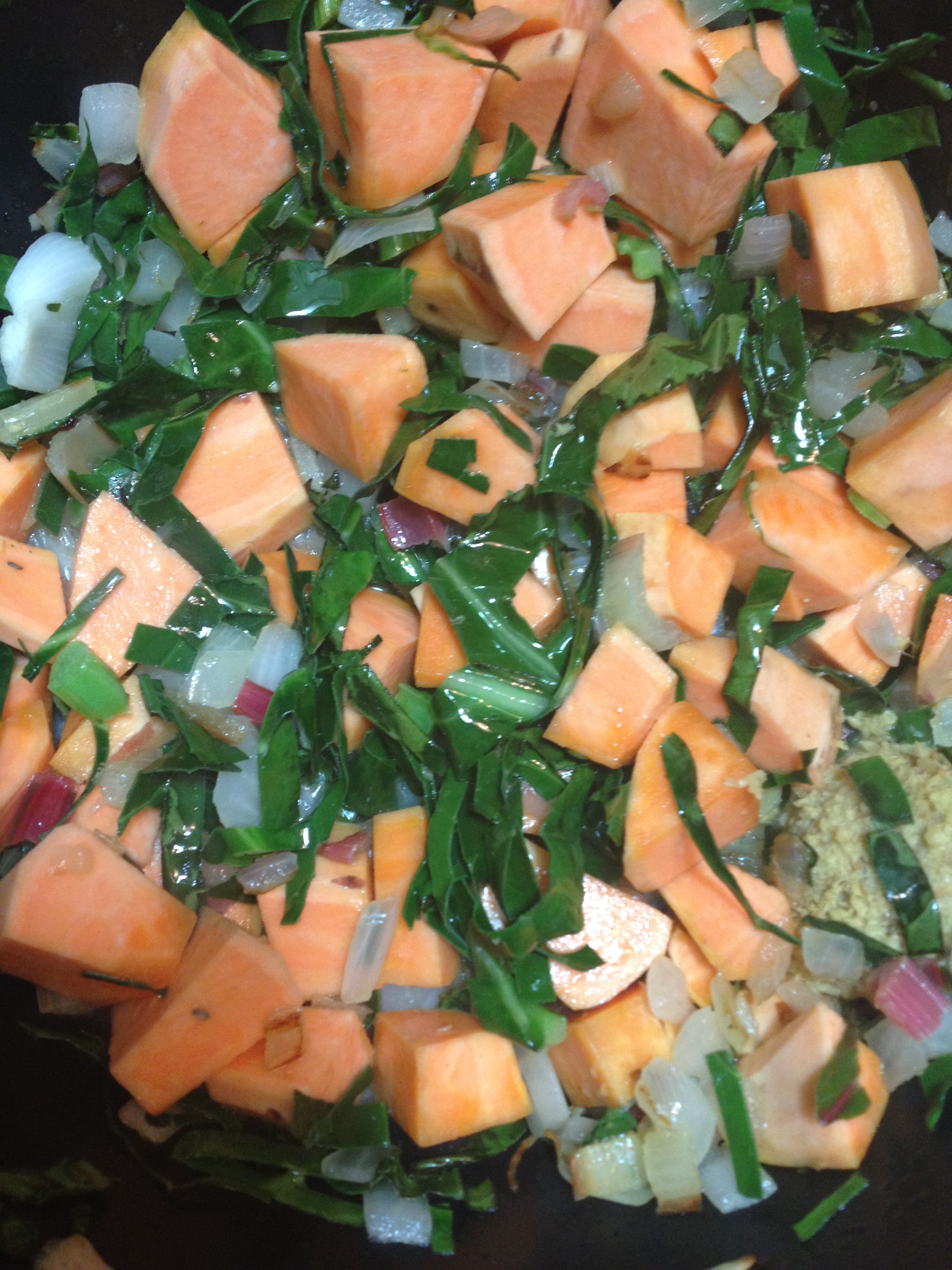 Sauté 1/2 a large onion in a couple tsp. of coconut oil. Add a coarsely chopped sweet potato and a couple of diced carrots. While those soften, roll up your greens (in this case I used a mix of brussels sprout leaves, kale and chard) and sliced them into thin ribbons; then chop those ribbons in half (longways). Add green (and/or purple) beans. Add 2-3 cloves of chopped garlic, as well as 2 TBS of freshly grated ginger (we grate several roots ahead of time and keep frozen lumps of grated ginger in our freezer for easy use) and a bit of finely diced hot pepper or a few pepper flakes or capsicum powder. Add a large piece of lemongrass stalk, pounded to open up the flavor fully. Stir until lightly coated in the coconut oil and beginning to soften.