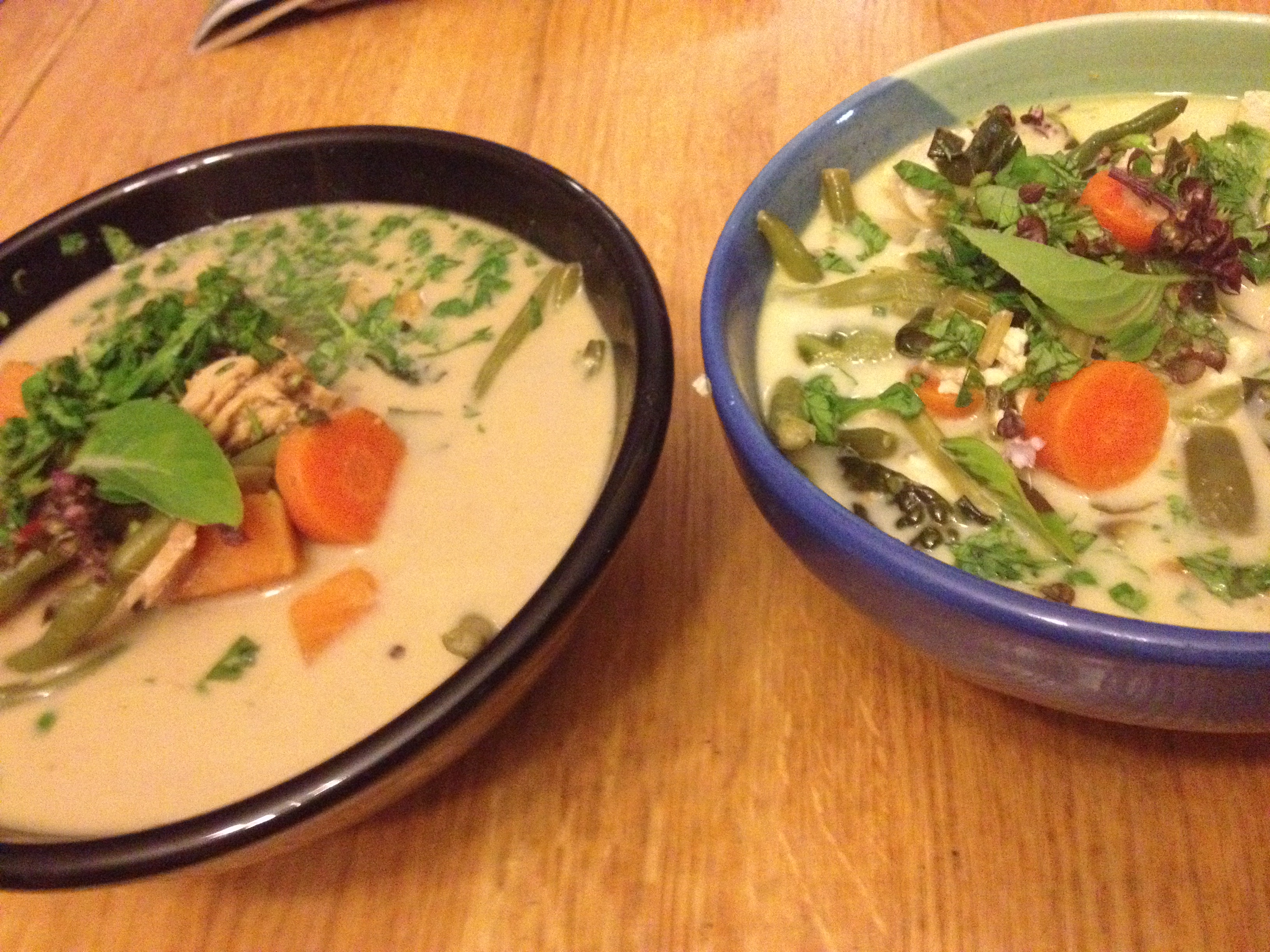 One of my favorite fall meals is a hearty Thai-style Coconut Stew that uses many later summer and early fall veggies. Tonight we made a vegan version (using tofu), as well as a fish-based version (using, yes, fish). The result was a bowls of fresh, filling, and warming soup. Perfect for the chilly evenings of fall.