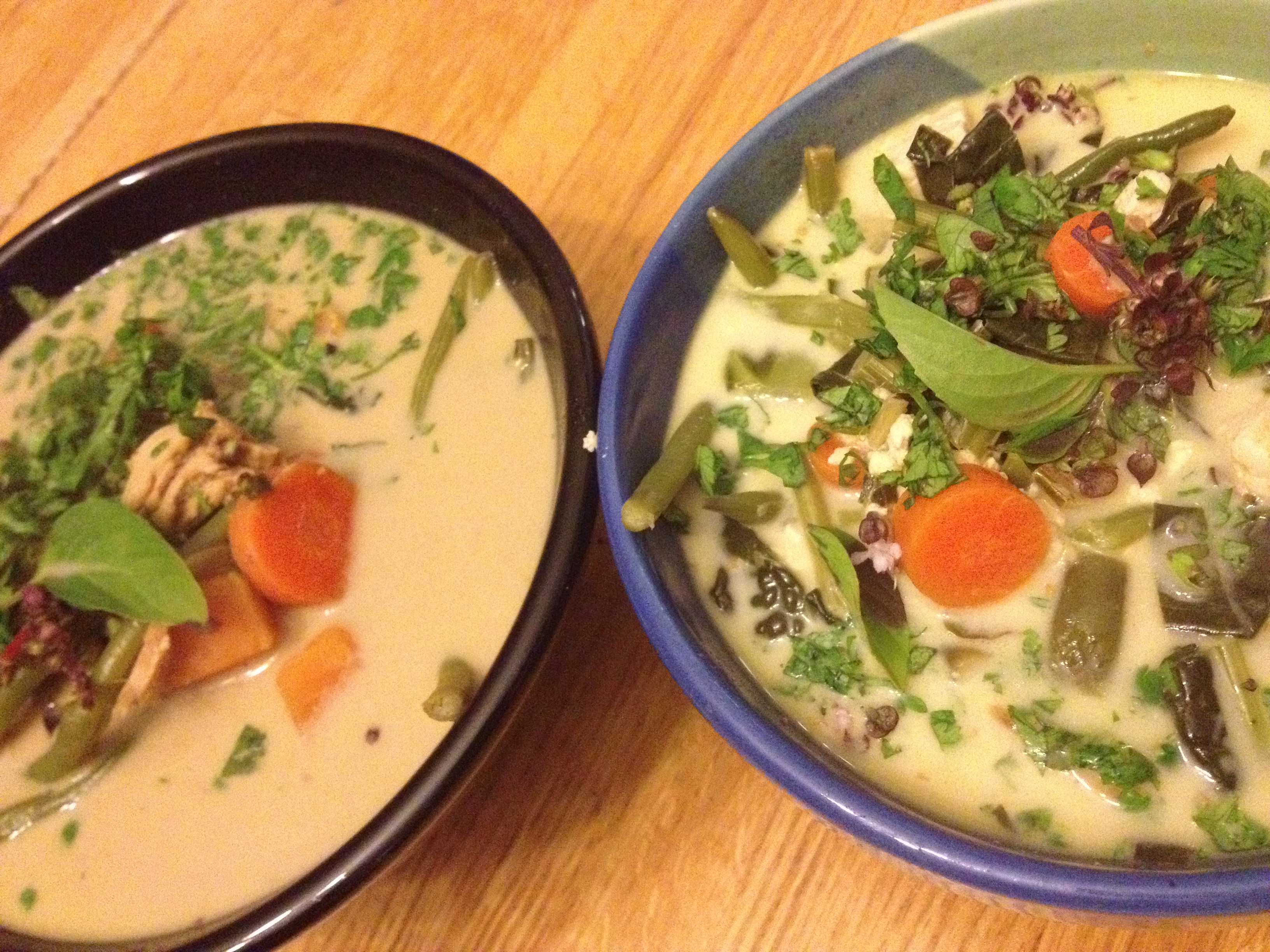 When your veggies are fully cooked, remove the pot from the heat and let sit for a few moments. Add coconut milk or cream and stir in to incorporate. (The important thing is not to only use “light” as I find that it leaves the soup a little watery and thin.) Add the juice of 1/2 a lime to the soup as well. Taste what you have and add more salt and/or lime and/or tamari to taste. The end result should be savory, sour and creamy all at once. Garnish with cilantro and basil if you have it, and enjoy!
